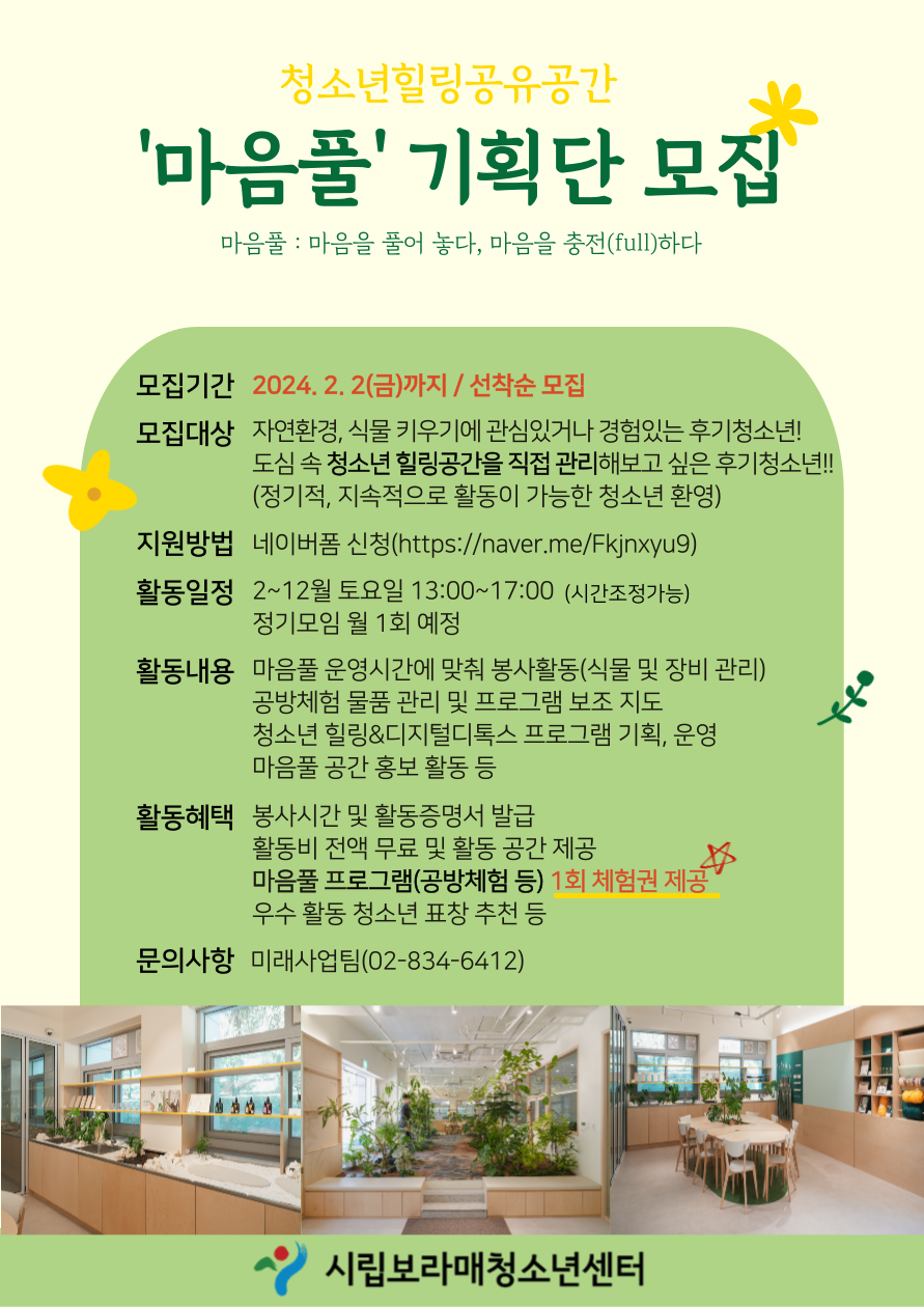 시립보라매청소년센터 청소년힐링공유공간 '마음풀' 기획단 모집