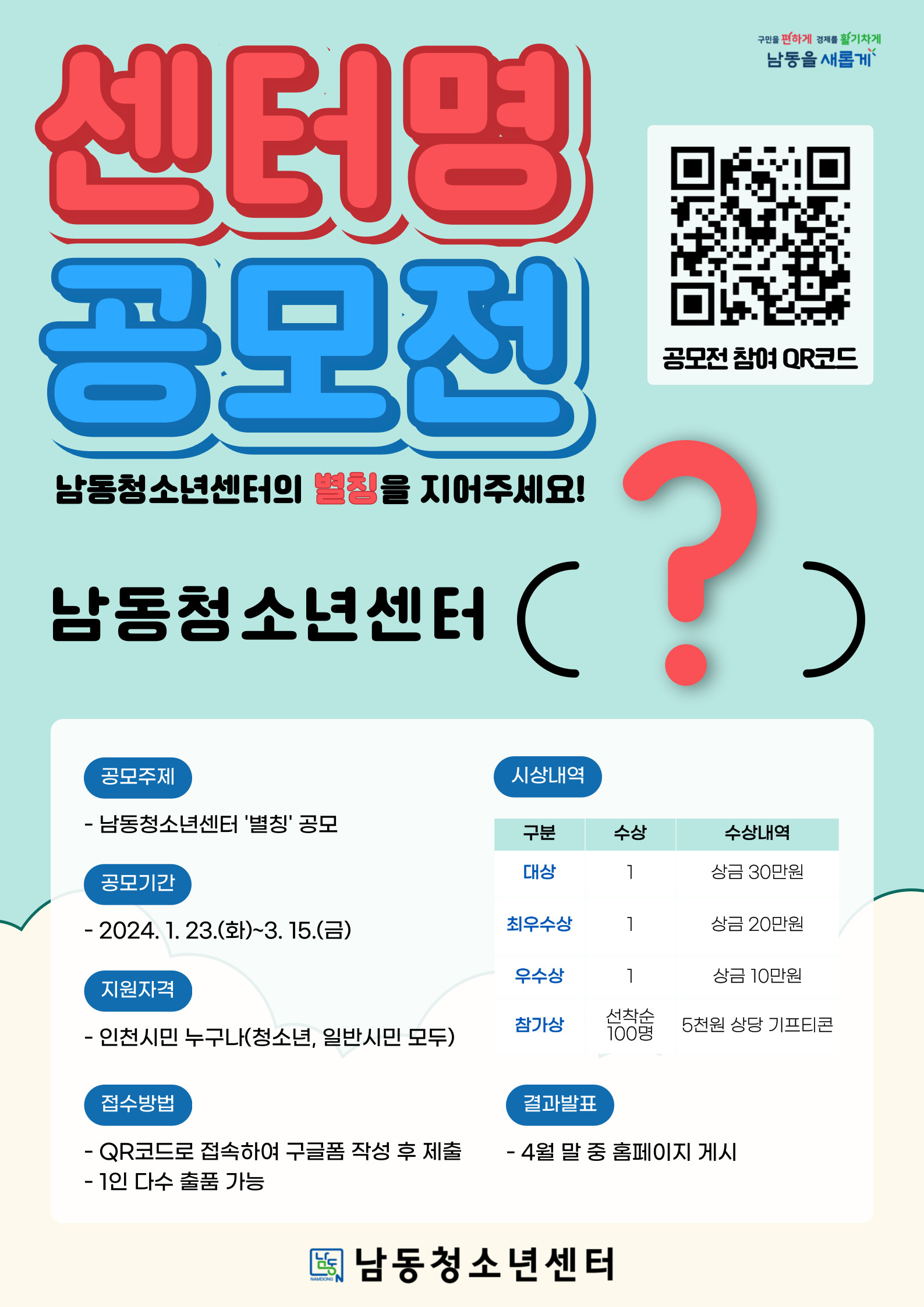 - 남동청소년센터에서 2024 센터명 공모전을 개최하오니