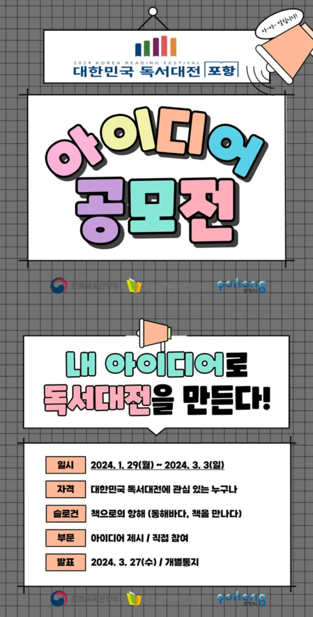 - 2024 대한민국 독서대전 포항 아이디어 공모전을 개최하오니
