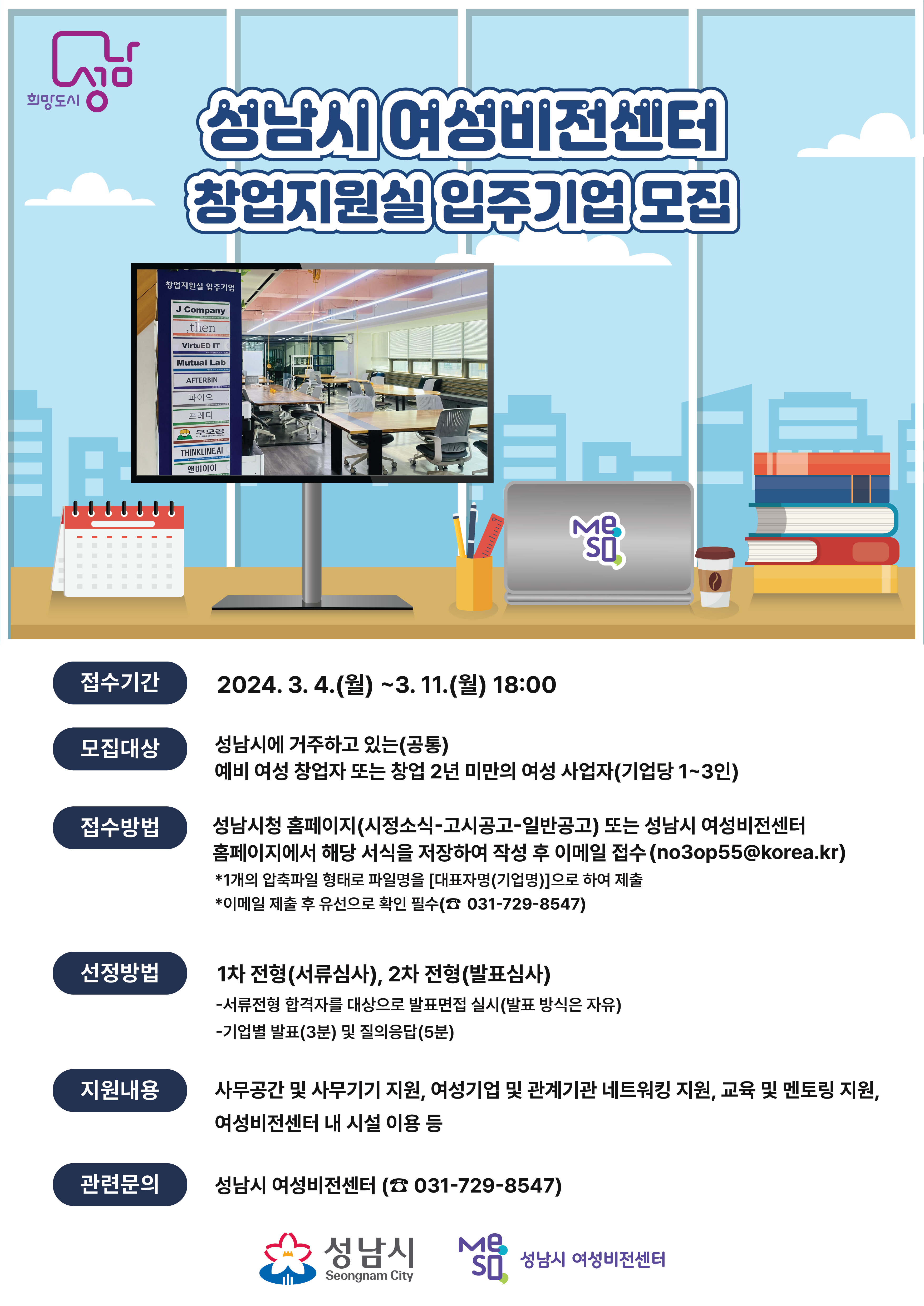- 입주위치 : 성남시 여성비전센터 창업지원실 (오픈형 사무공간)