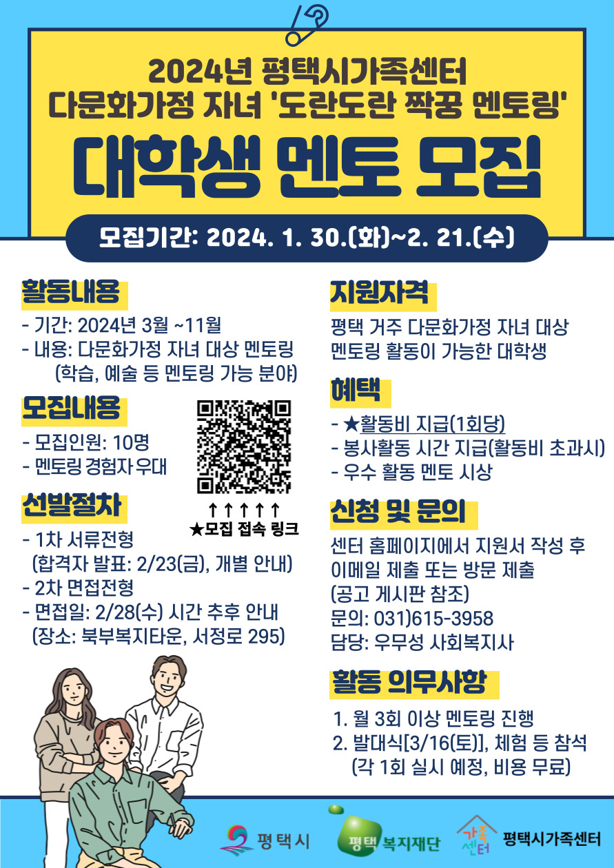 - 2024년 다문화가정 자녀 도란도란 짝꿍 멘토링 대학생 멘토를 모집하오니