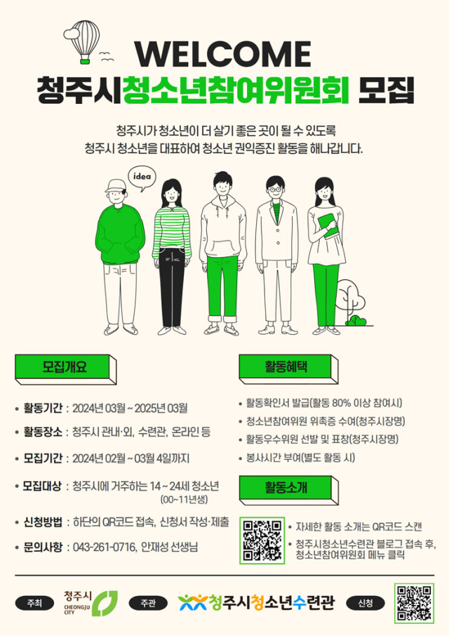 | 혜택 | 활동우수청소년 매년 청주시장표창 수여, 교육비, 식사 및 간식비, 활동비 지원 外 |