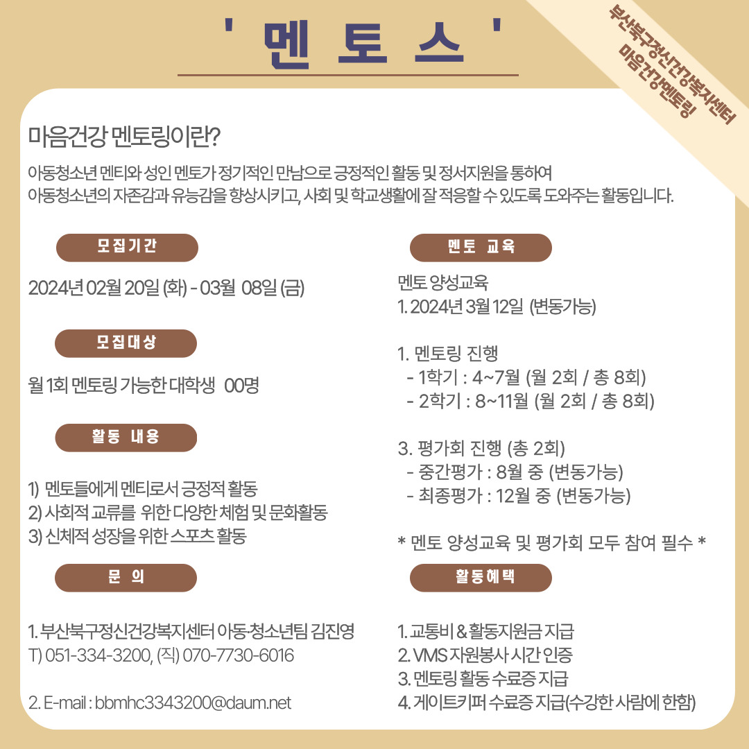 · 멘토 양성교육 : 2024년 3월 12일 예정 (변동가능)