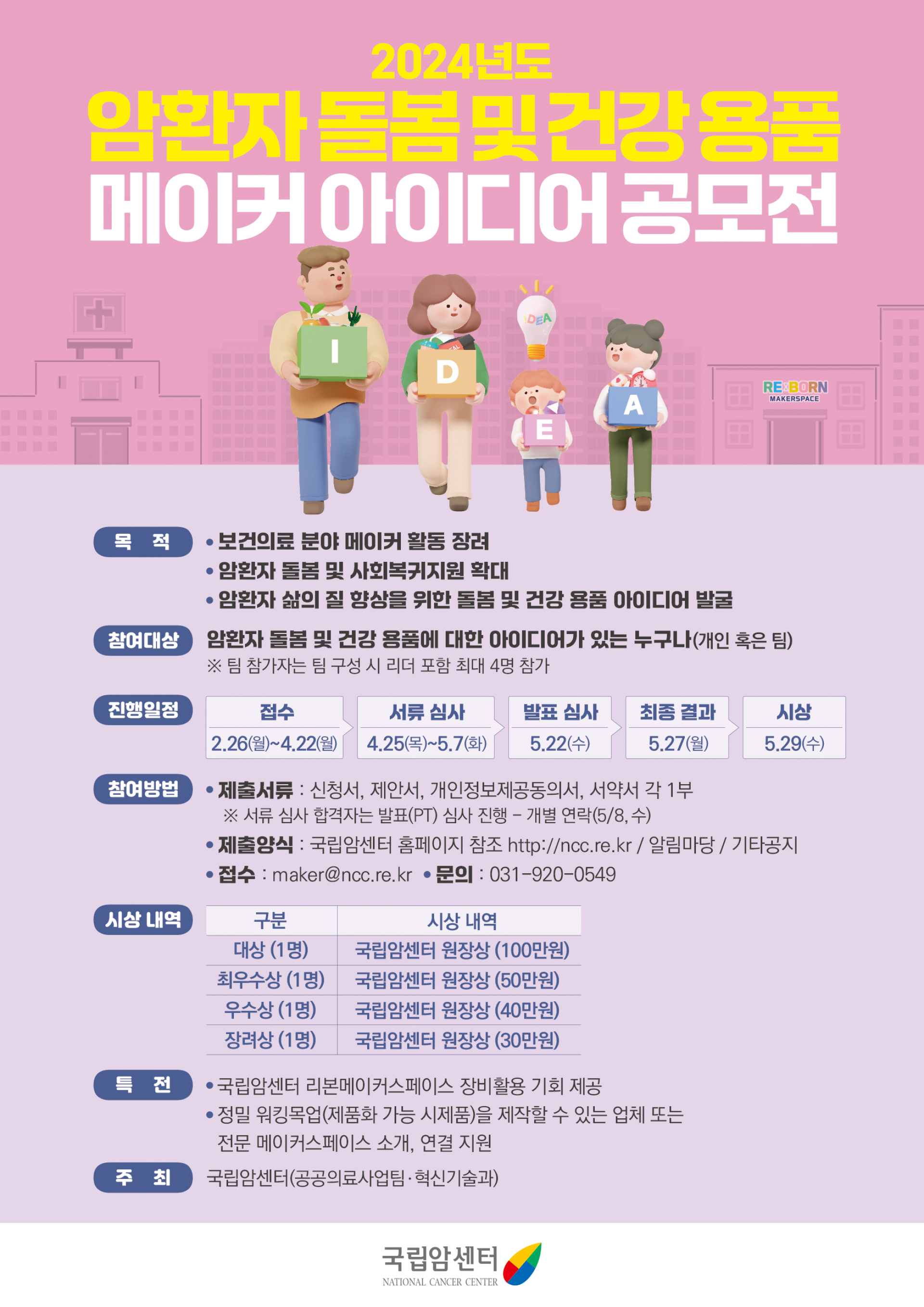 - 국립암센터에서는 [2024년도 암환자 돌봄 및 건강용품 메이커 아이디어 공모전]을