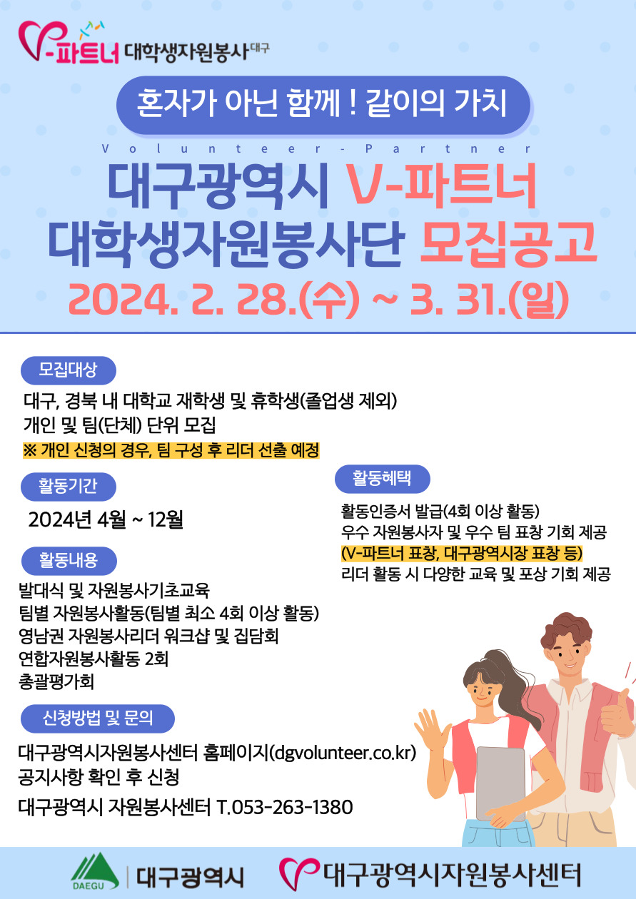 대구광역시 제8기 V-파트너 대학생자원봉사단 모집을 시작합니다.