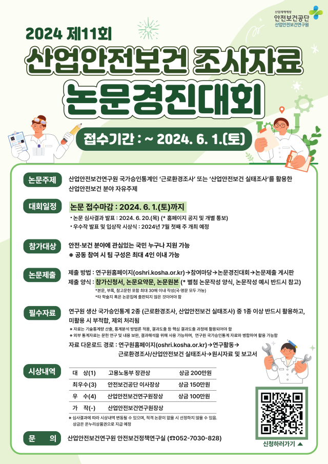 - 산업안전보건연구원에서 「제11회 산업안전보건 조사자료 논문 경진대회」를 개최합니다. 많은 참여 바랍니다.