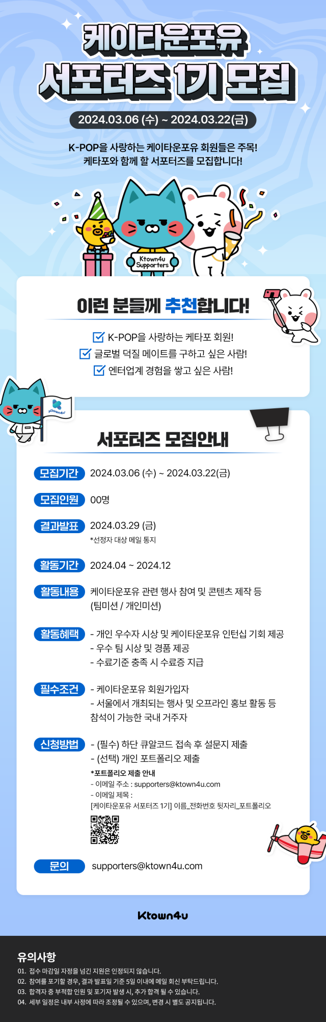 - 이메일 제목 : [케이타운포유 서포터즈 1기] 이름_전화번호 뒷자리_포트폴리오