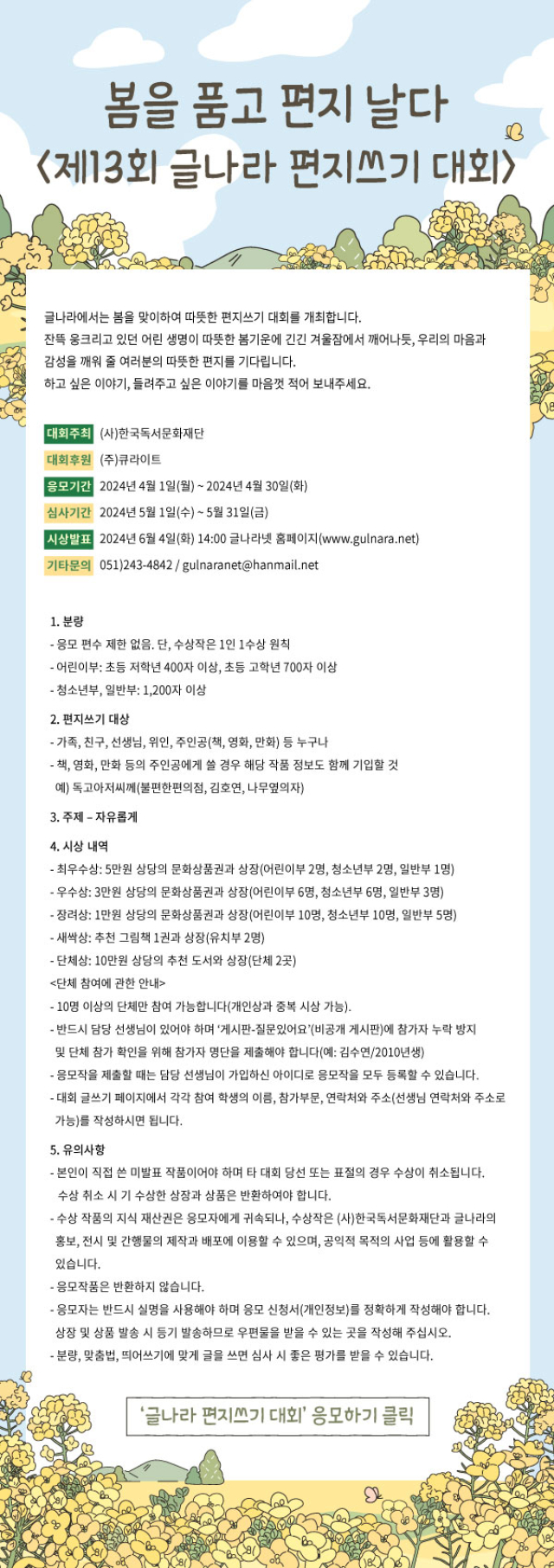 제13회 글나라 편지쓰기 대회 '봄을 품고 편지 날다'