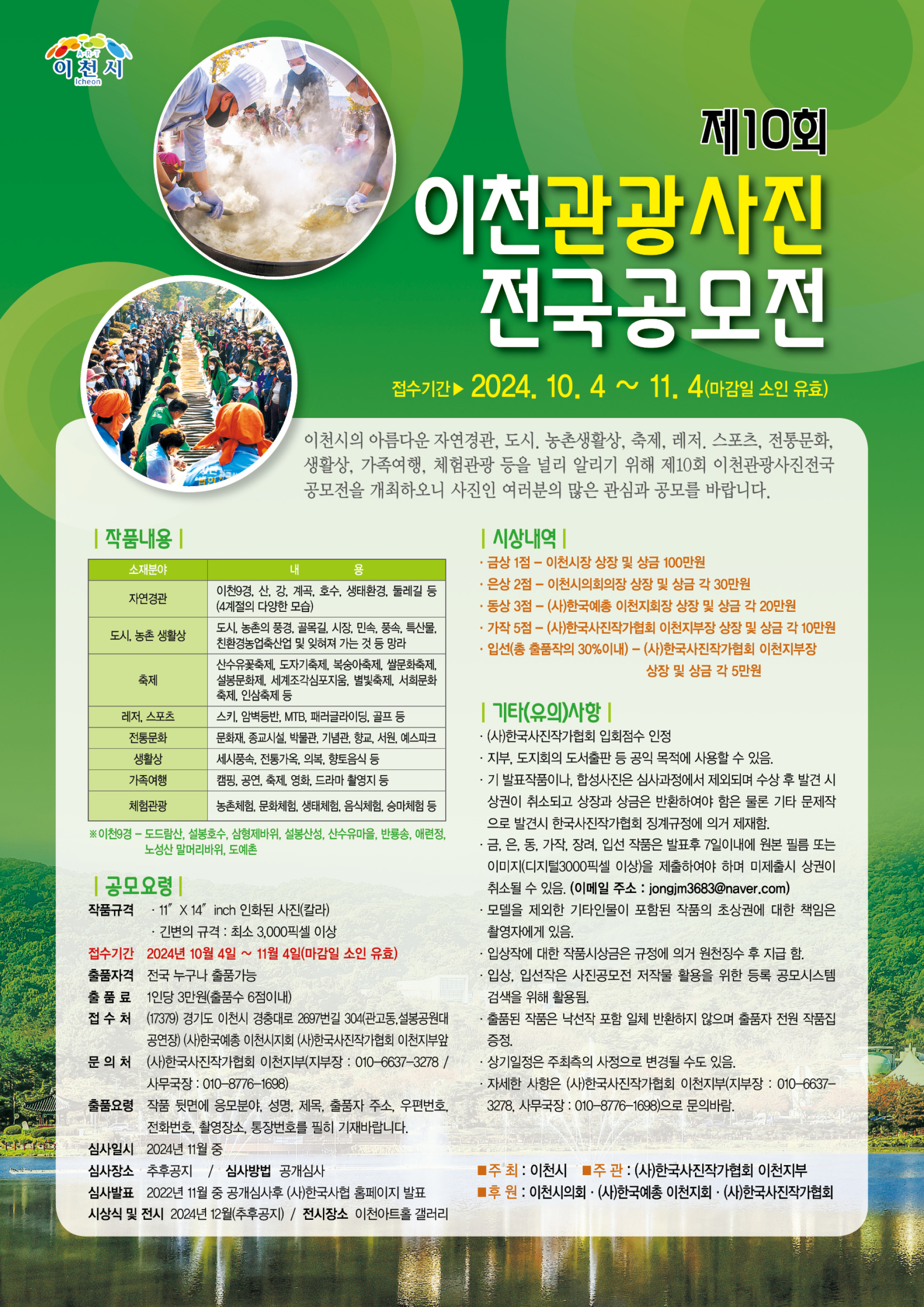 - 제10회 이천관광 전국 사진 공모전에 관심있는 분들의 많은 참여 바랍니다.