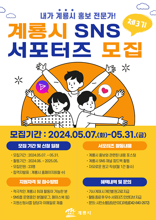 참여해 주실 『제3기 계룡시 SNS 홍보 서포터즈』를 모집하오니