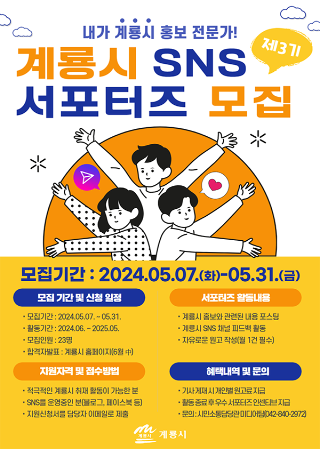 참여해 주실 『제3기 계룡시 SNS 홍보 서포터즈』를 모집하오니