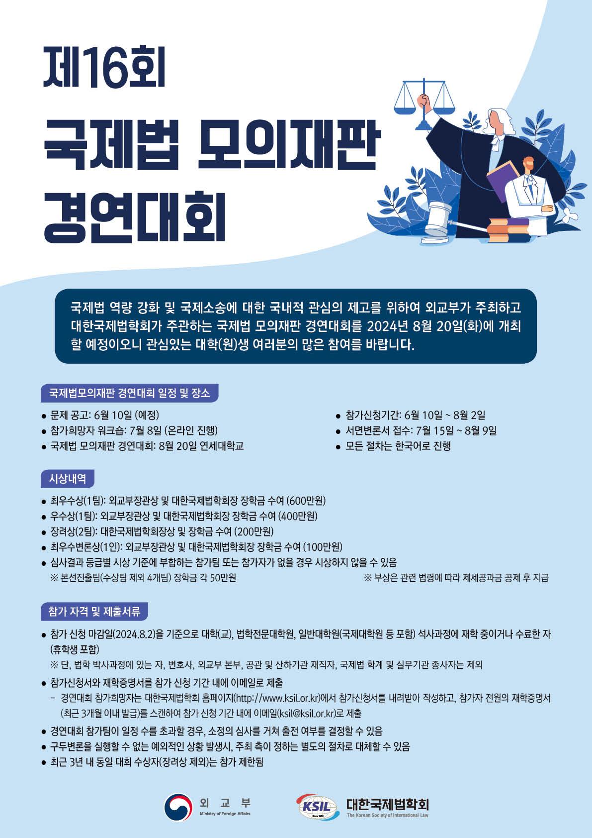 - 모의재판 경연대회 신청 기간: 2024. 6. 10. – 8. 2.