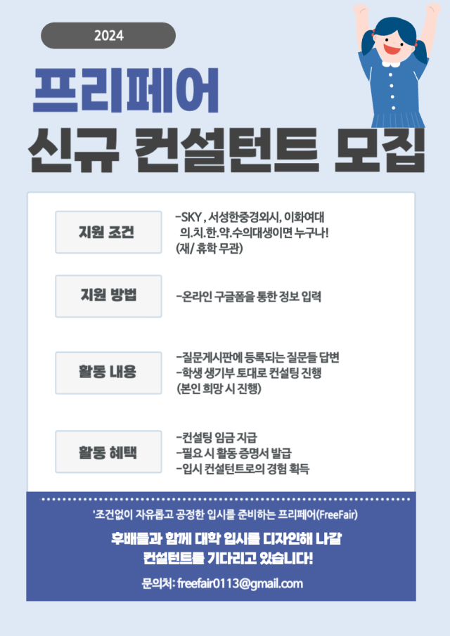 | 혜택 | 활동에 따른 임금 지급, 필요 시 활동 증명서 발급, 입시 컨설턴트로의 경험 획득 |