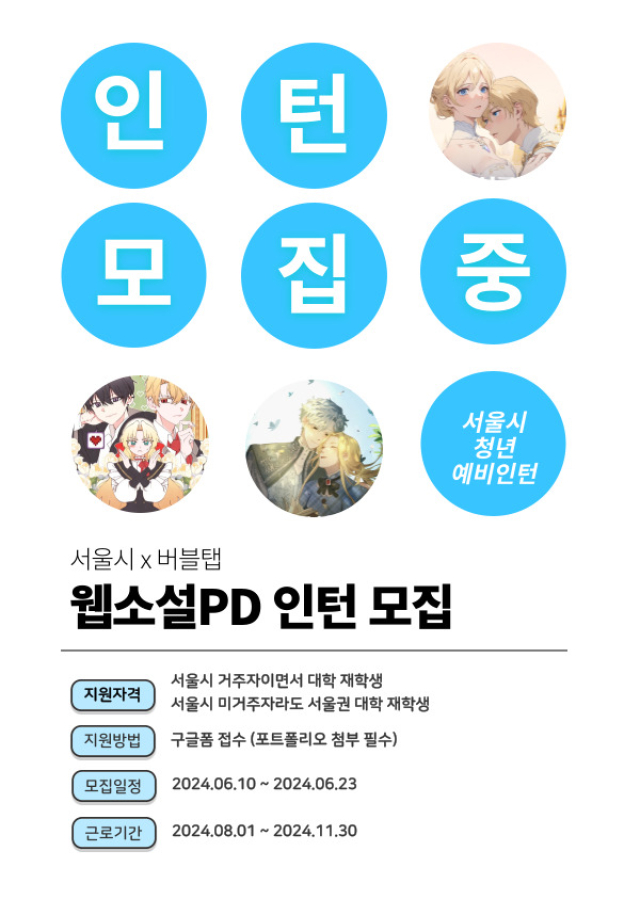 - 서울시x버블탭 청년 예비 인턴 콘텐츠 마케터, 웹소설PD 모집