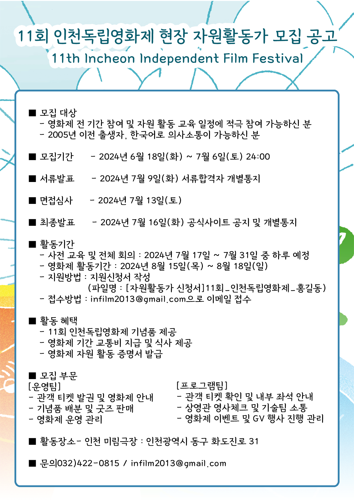 - 지원방법 : 지원신청서 작성 (파일명 : [자원활동가 신청서]11회_인천독립영화제_홍길동)