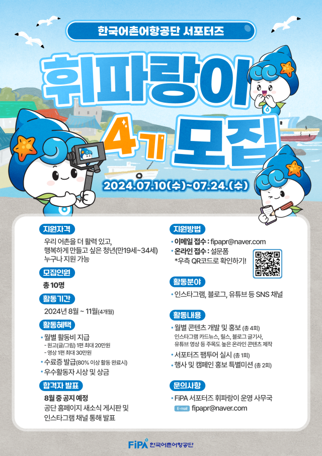 [한국어촌어항공단] 2024년 FiPA 서포터즈 <휘파랑이> 4기 모집 공고 (~7/24)