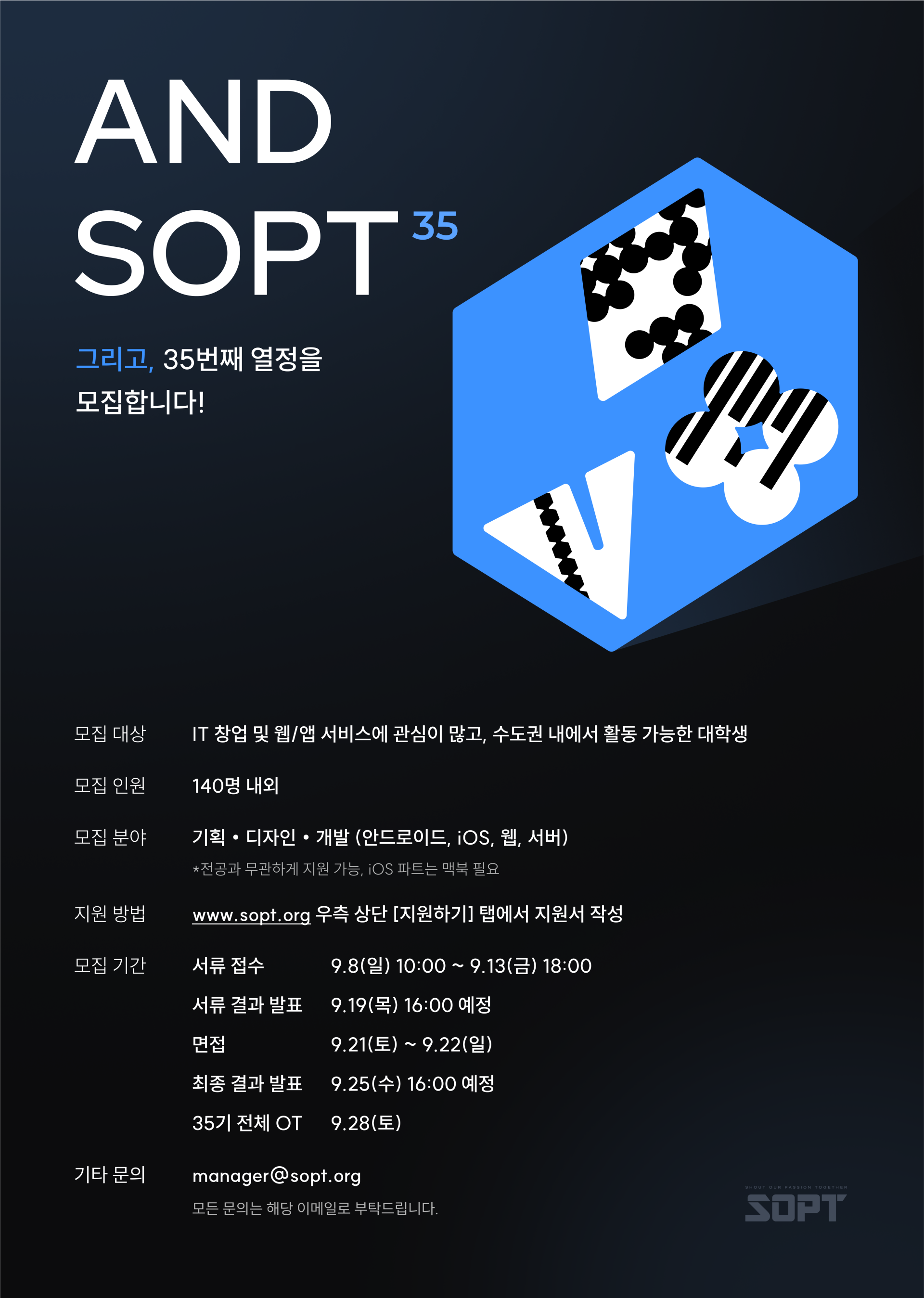 국내 최대 규모 대학생연합 IT벤처창업 동아리 SOPT 35기 회원 모집