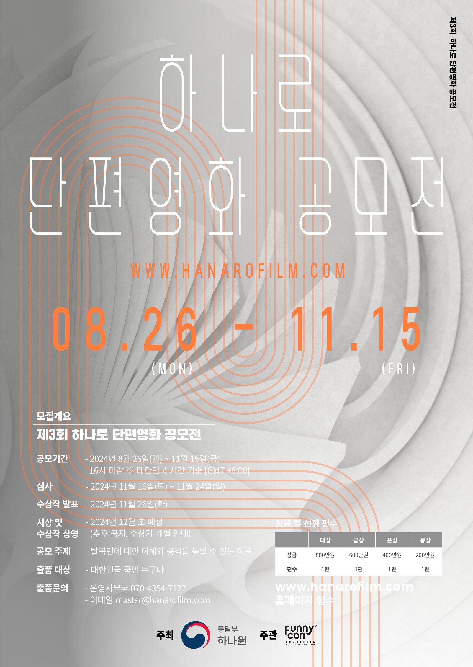 - 문의 : 제3회 하나로 단편영화 공모전 사무국 ㈜퍼니콘 070-4354-7127, master@hanarofilm.com)