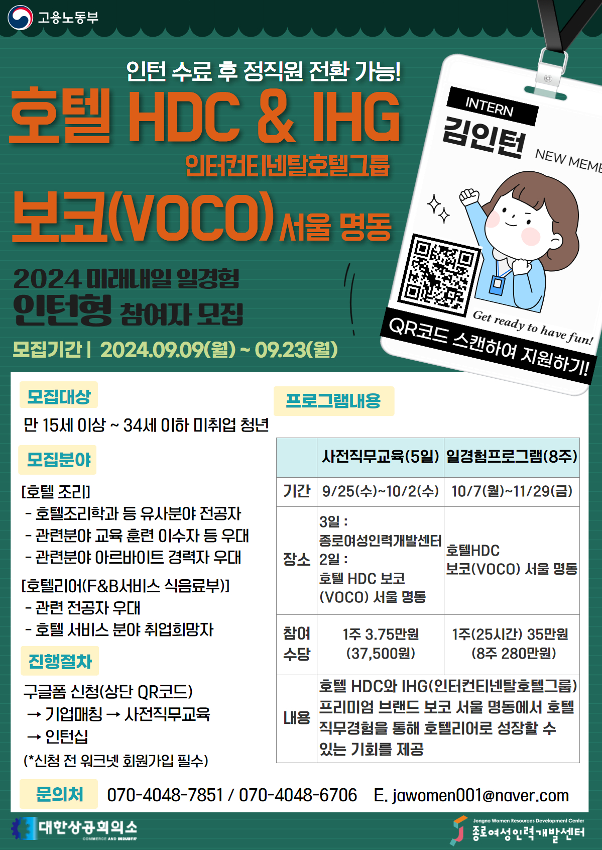 - 사전직무교육 : 종로여성인력개발센터(3일), 호텔HDC&IHG 보코(VOCO) 서울 명동(2일)