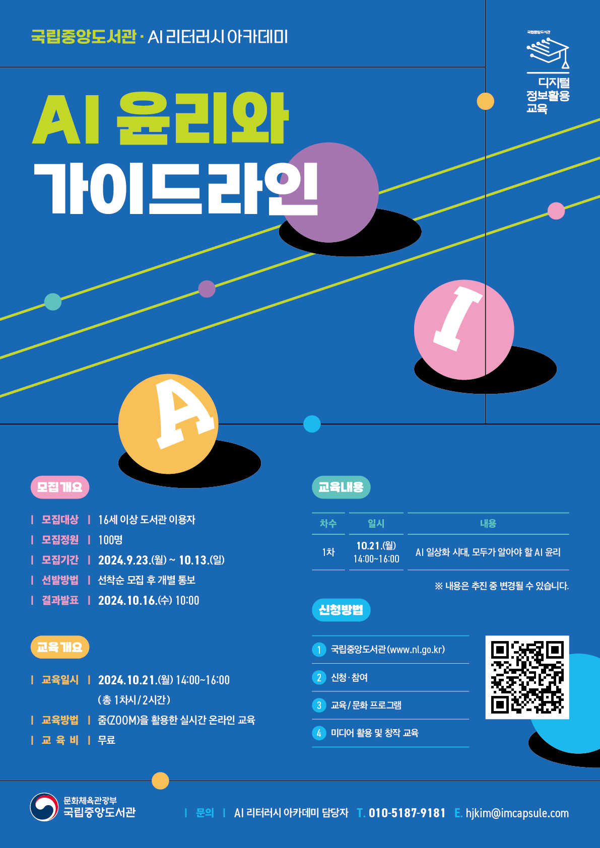 - 국립중앙도서관에서는 AI 리터러시 아카데미 「AI 윤리와 가이드라인」 교육 과정을 운영합니다.