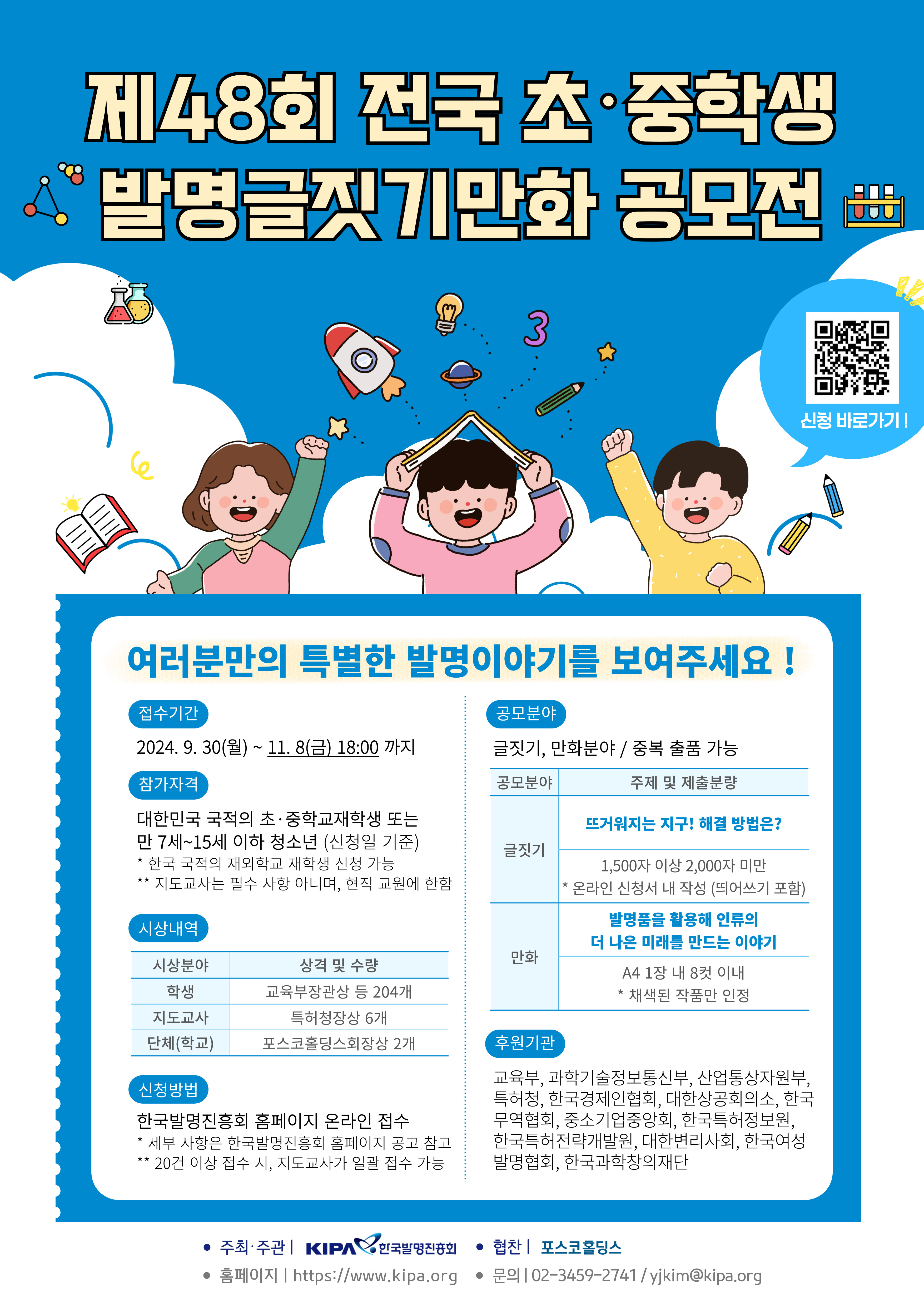 - 웹사이트 로그인 → 지원사업 → 학생교원전시/행사 → 전국 초중학생 발명글짓기만화공모전 → 대회신청