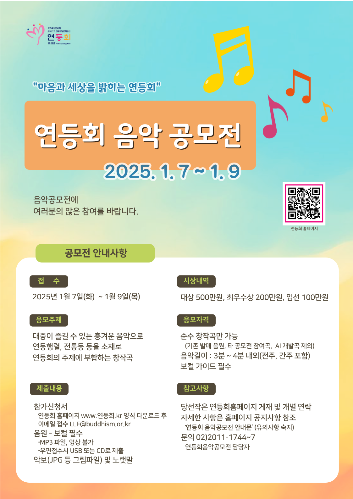 신나는 연등회 음악을 공모하오니 관심있는 여러분들의 많은 참여를 바랍니다.