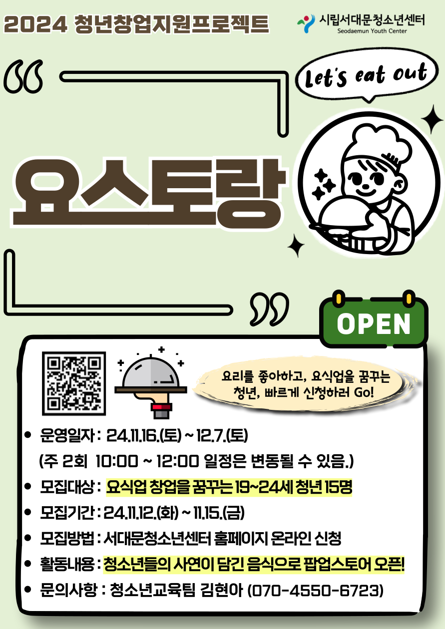 2024년 시립서대문청소년센터 청년창업프로젝트 '요스토랑' 참여자 모집