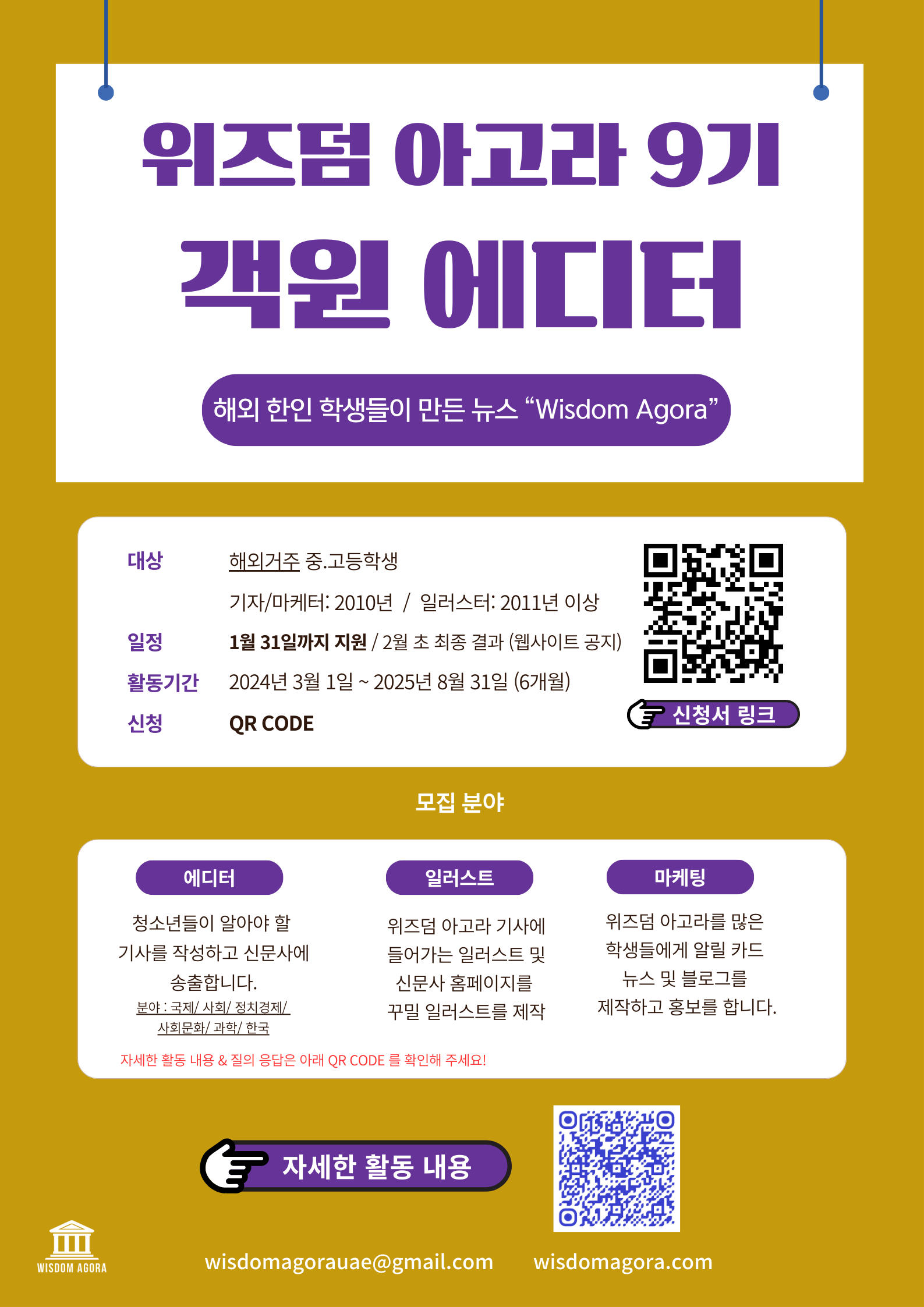 (해외 거주 중.고등학생) 위즈덤 아고라 9기 객원 에디터 모집