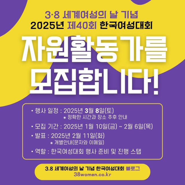 세계여성의 날 기념 2025년 제40회 한국여성대회 자원활동가를 모집합니다!