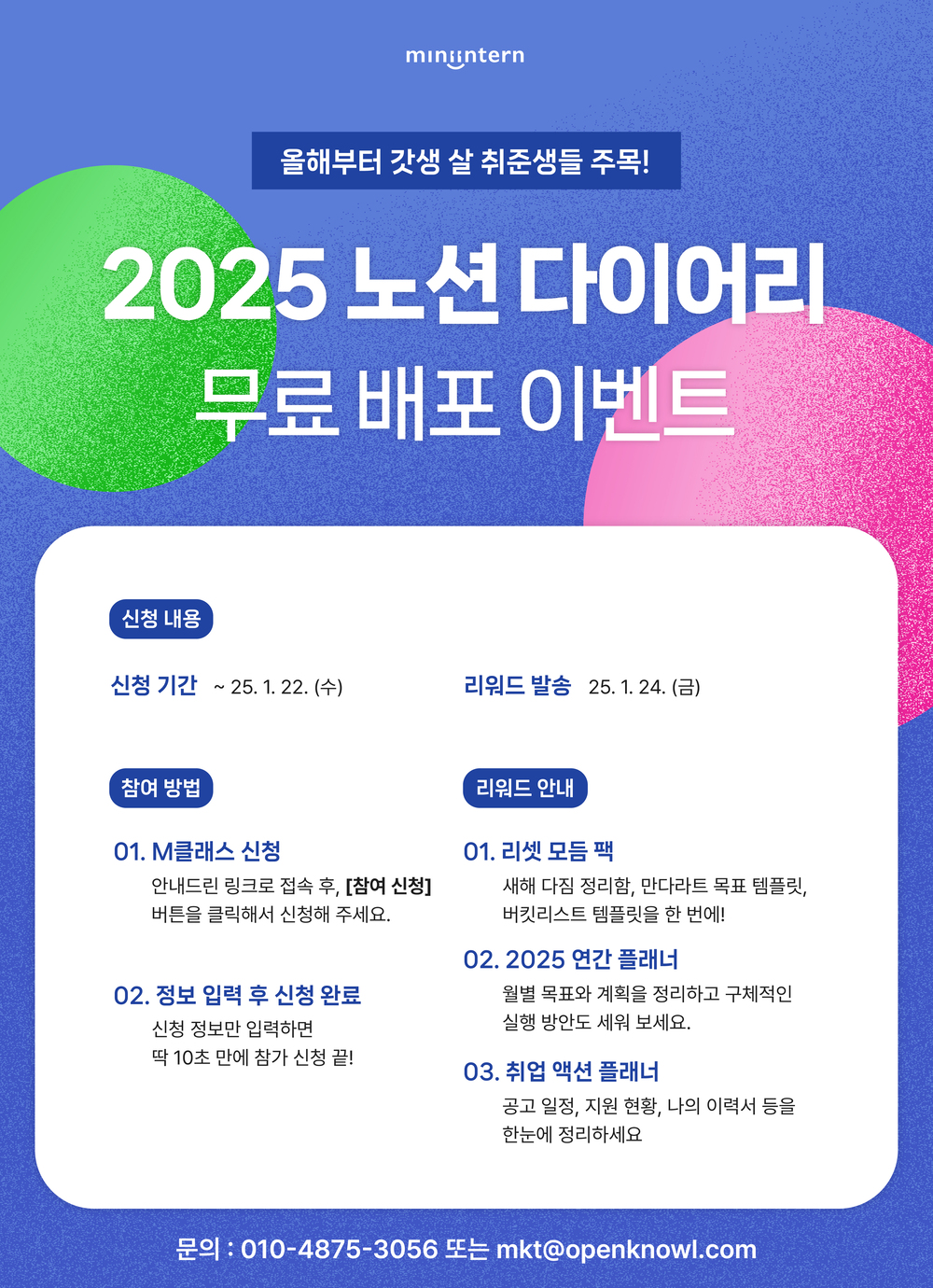 | 혜택 | 1️⃣ 리셋 모듬 팩 (새해 다짐 정리함, 만다라트 목표 템플릿, 버킷리스트 템플릿) 2️⃣ 2025 연간 플래너 3️⃣ 취업 준비 액션 플래너 |