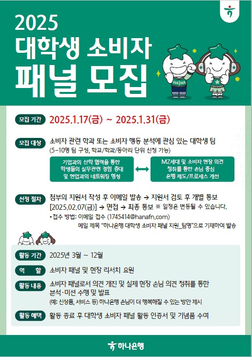 - 2025 하나은행 대학생 소비자 패널을 모집합니다.