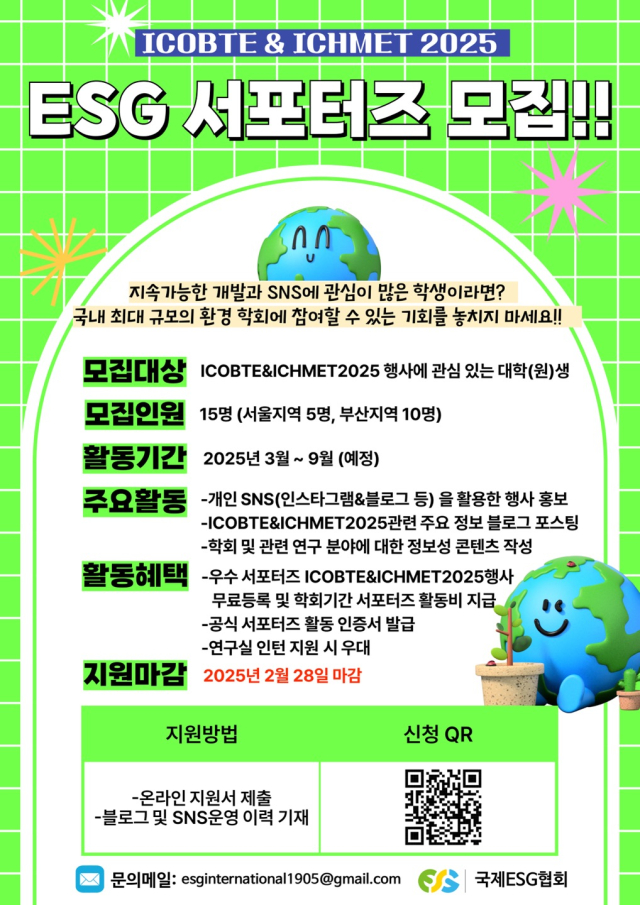 - 우수 서포터즈 선정 시 ICOBTE & ICHMET 2025 행사 무료 등록 및 학회 기간 활동비 지급