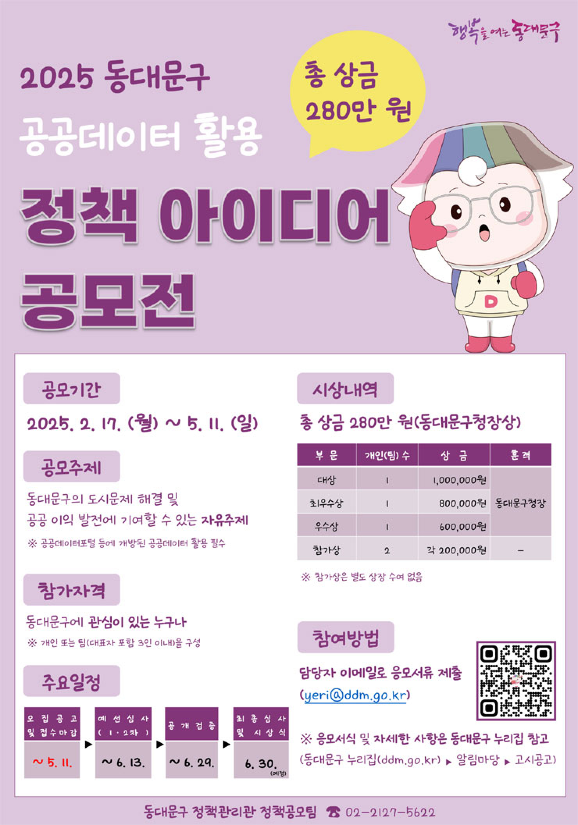 - ☏ 서울특별시 동대문구청 정책관리관 정책공모팀 02-2127-5622