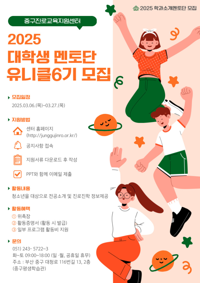- 2025년 부산중구진로교육지원센터 대학생멘토단 유니클 6기를 모집하오니