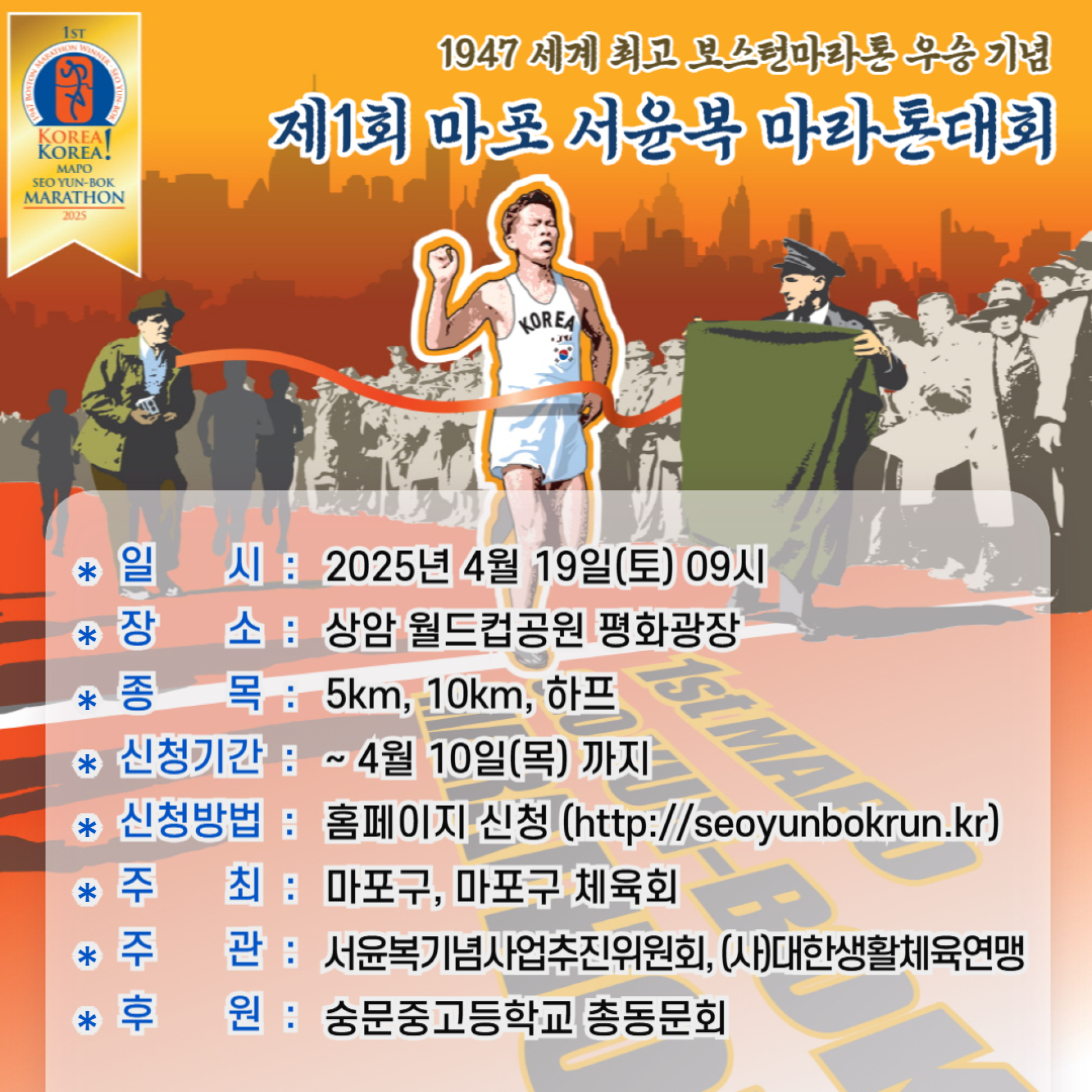 | 주관 | 서윤복 기념사업 추진위원회, (사)대한생활체육연맹 |