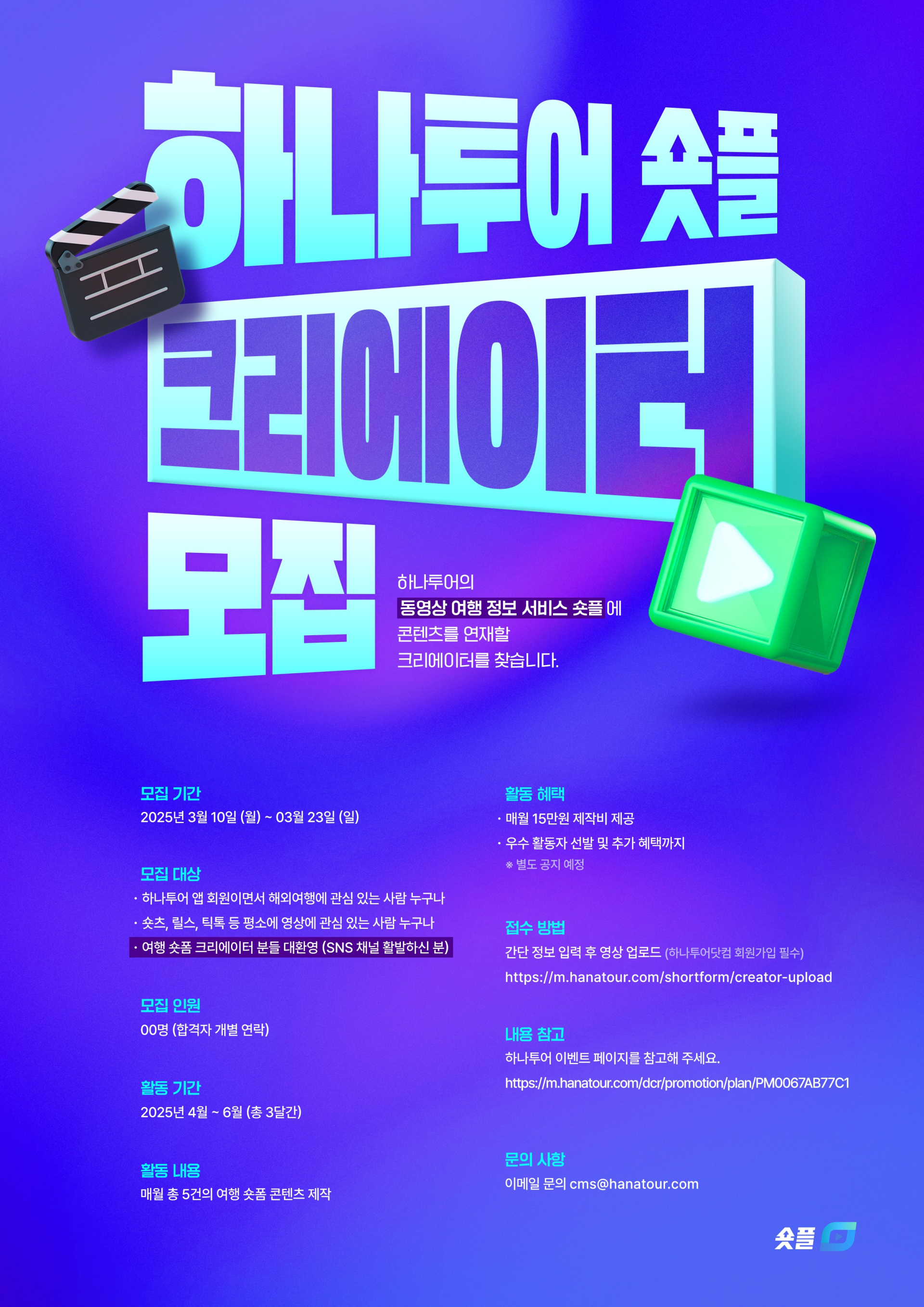 - 하나투어의 동영상 여행 정보 서비스 숏플에 콘텐츠를 연재할 크리에이터를 찾습니다.