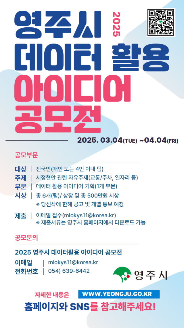 【2025년 영주시 데이터 활용 아이디어 공모전】을 개최하오니 많은 참여 바랍니다.
