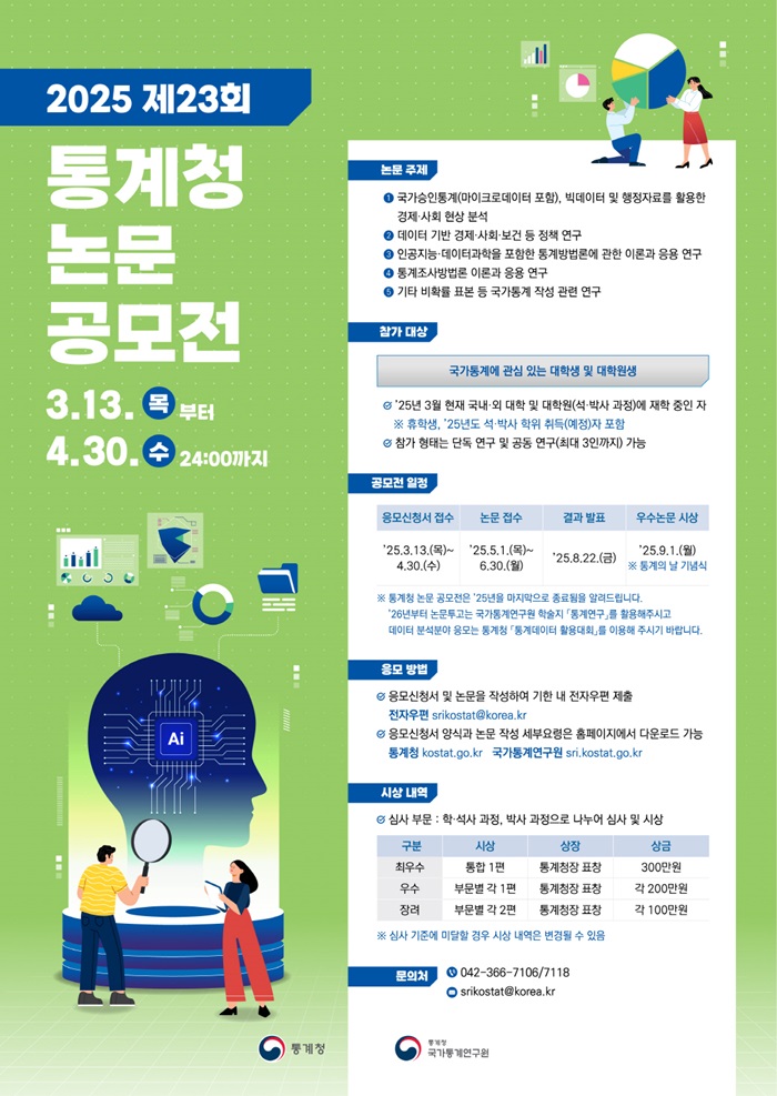 - 수상자 혜택 : 통계청 주관「제15회 국가통계방법론 심포지엄」('25년 9월 예정) 세션 발표 및