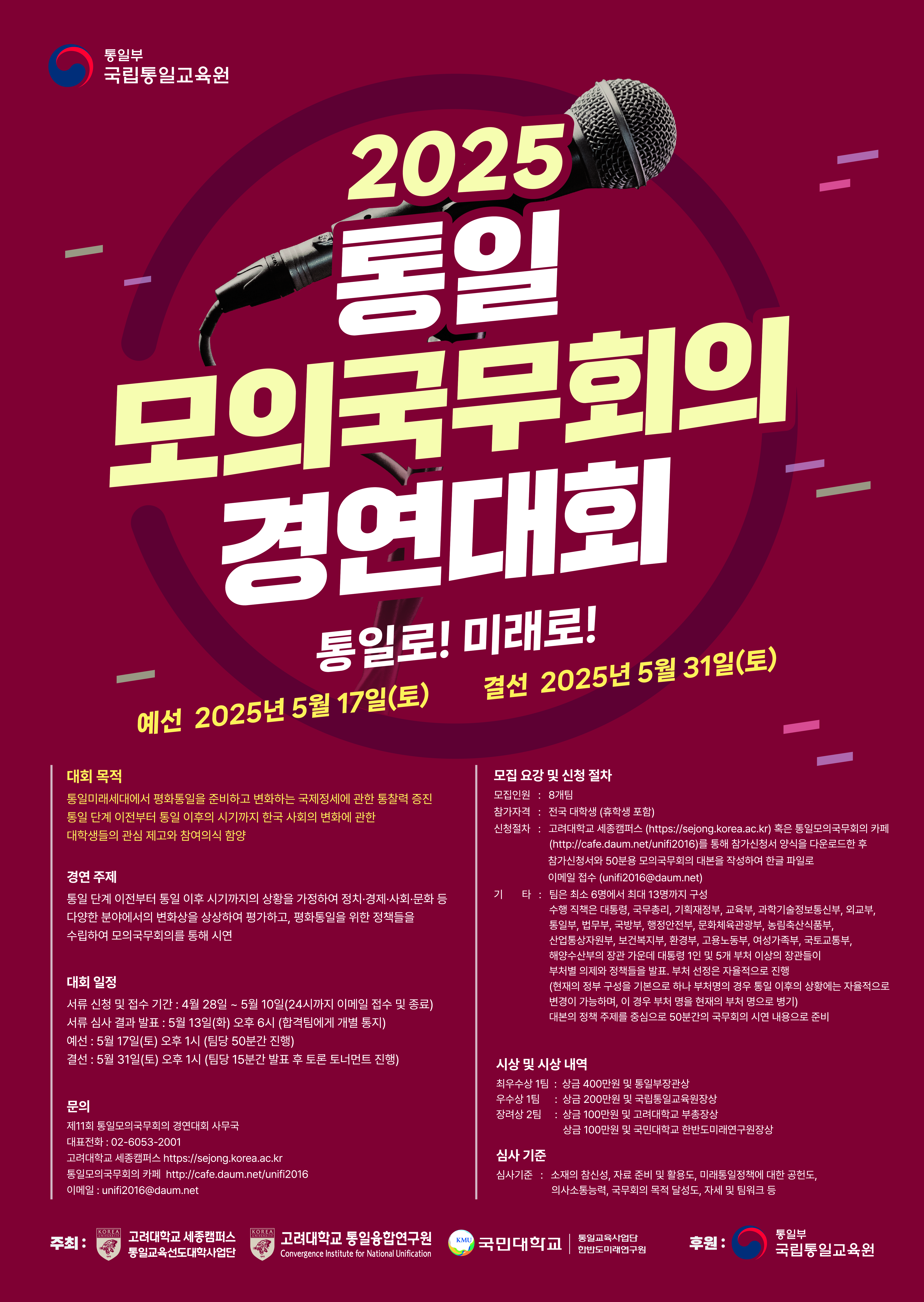 | 주최 | 고려대학교 세종캠퍼스 통일교육선도대학사업단, 고려대학교 통일융합연구원, 국민대학교 통일교육사업단 |