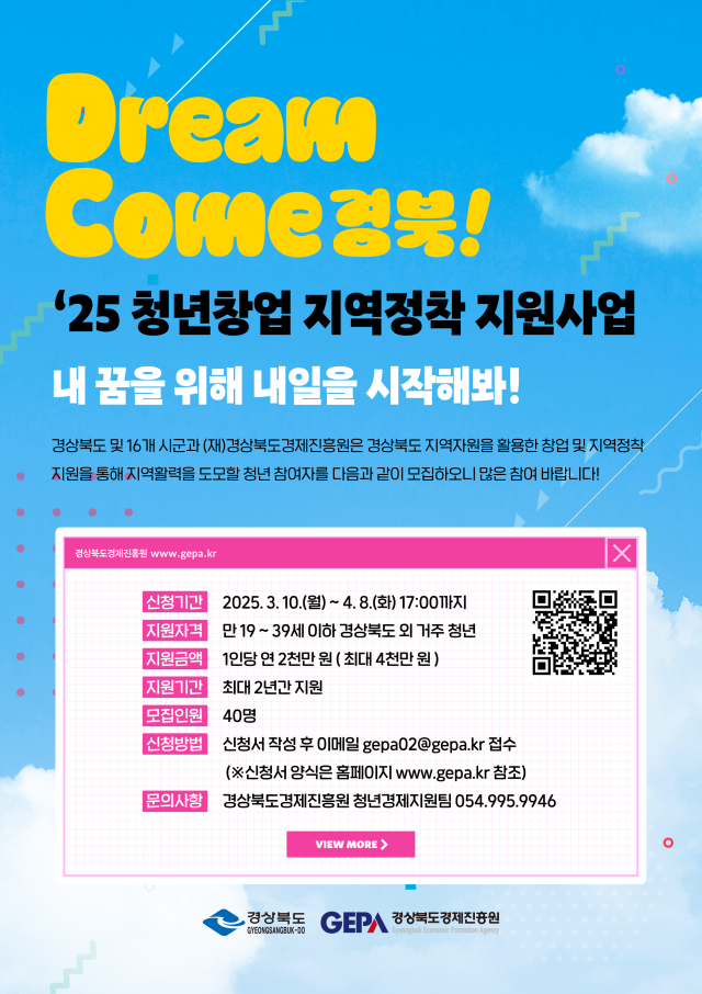 - 지원 대상 : 경북 지역에서 창업 및 정착을 희망하는 청년