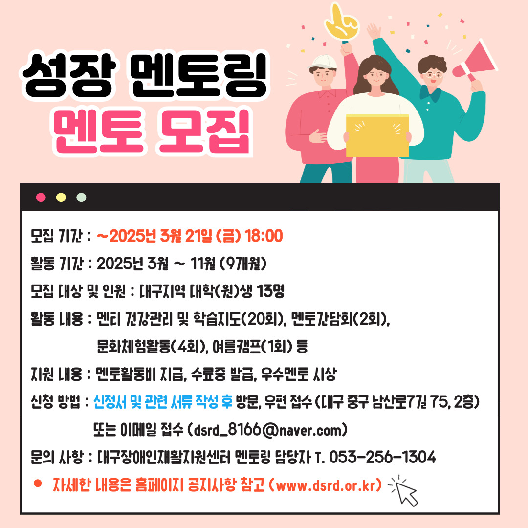 - ☏ 대구광역시 장애인재활협회 : 053-256-1304 (성장멘토링 담당자)