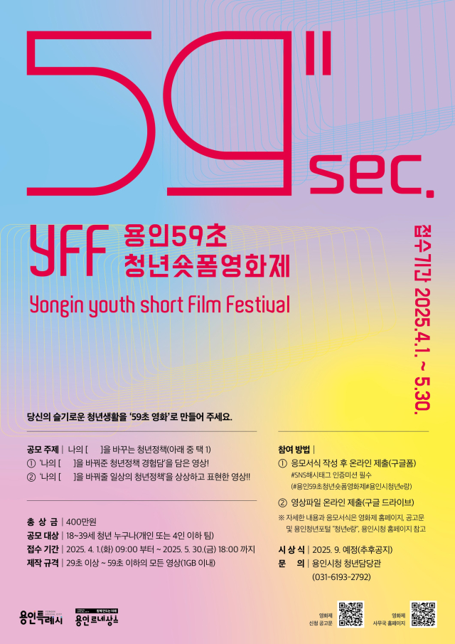 - 용인 59초 청년 숏폼 영화제에 상영할 영상 공모전을 진행합니다.