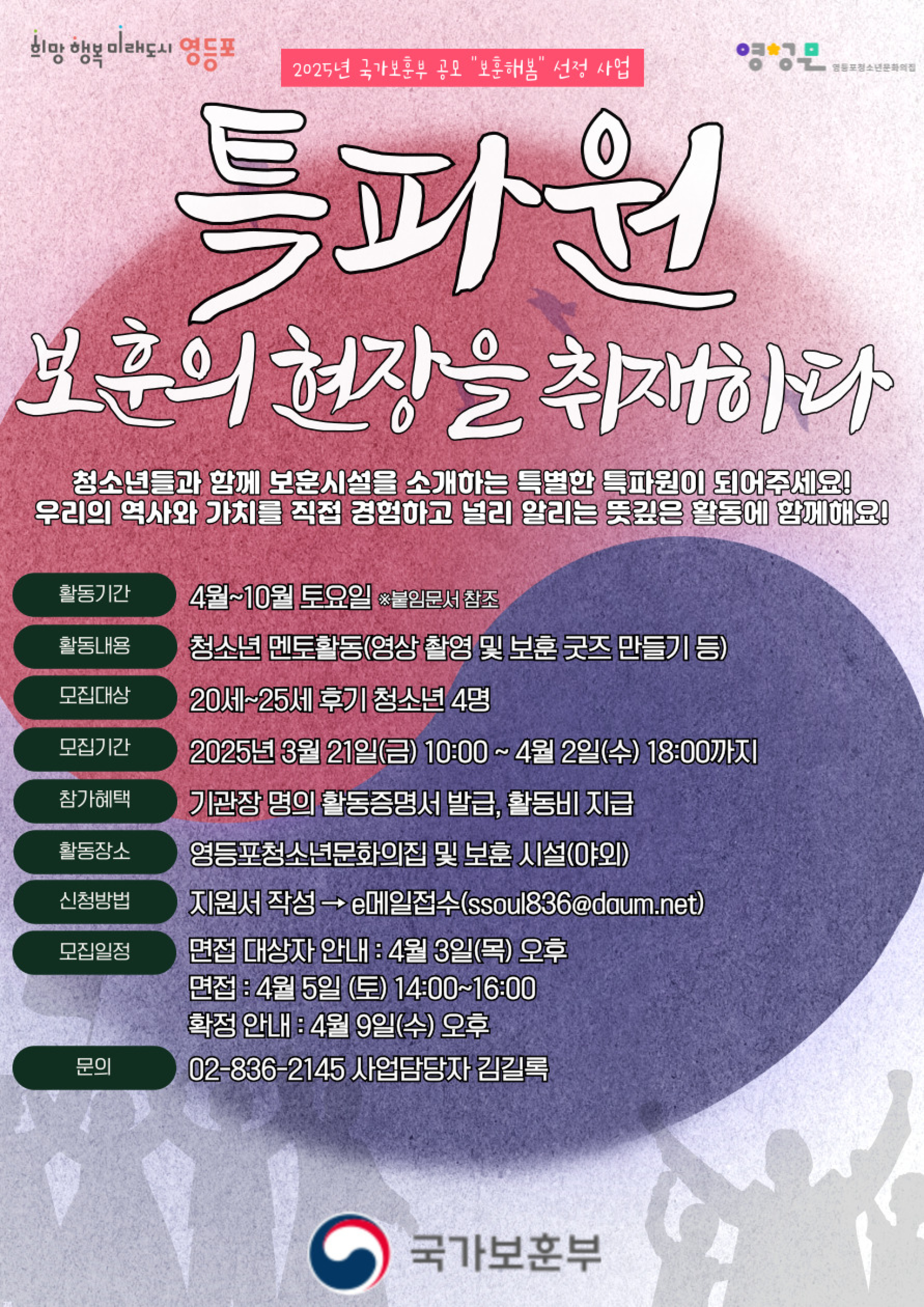 - ☏영등포청소년문화의집 사업담당자 김길록 02-836-2145