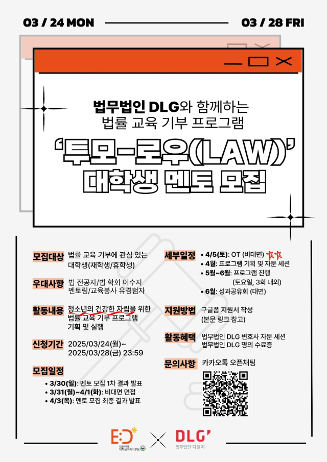 법무법인 DLG와 함께하는 법률 교육 기부 프로그램 ‘투모-로우(law)’ 대학생 멘토 모집