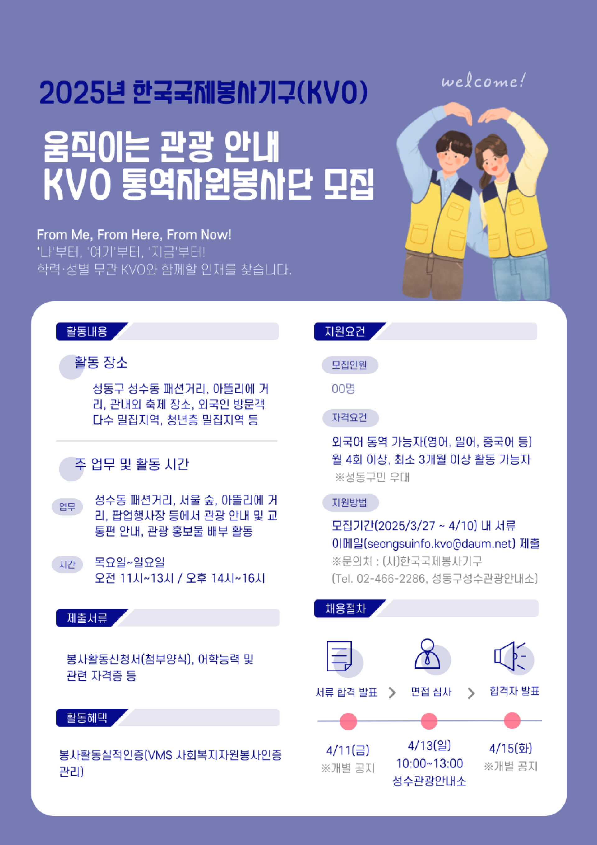 - 면접심사 : 2025. 4. 13(일), 10:00~13:00 / 성수관광안내소