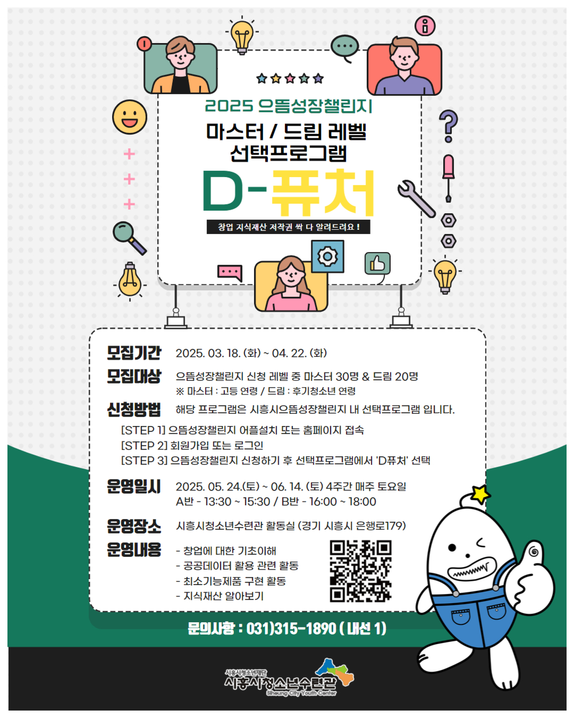 - 시흥시 청소년종합성장지원프로젝트 으뜸성장챌린지 내 선택프로그램으로, 으뜸성장챌린지와 함께 신청이 가능합니다.