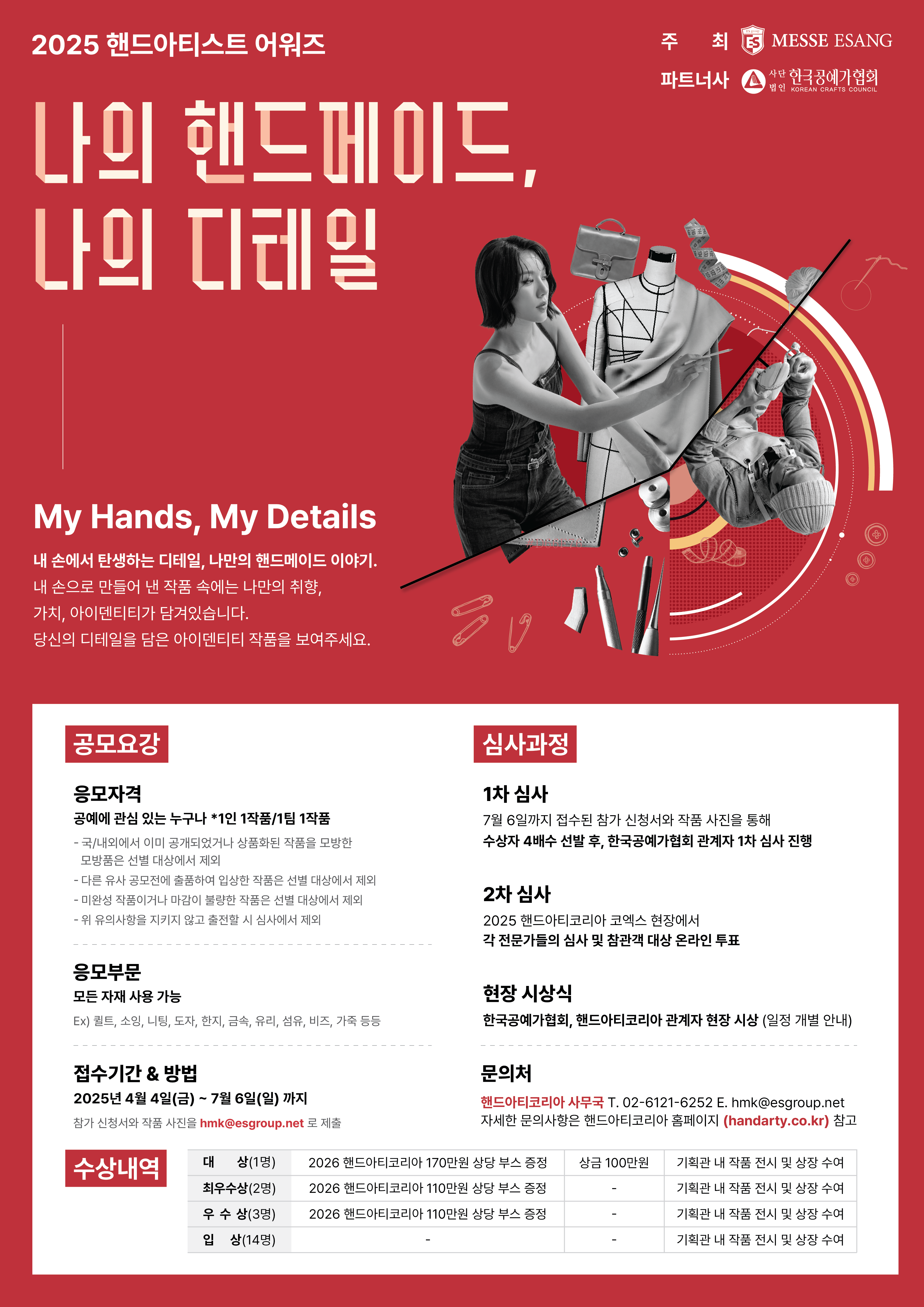 - 1차 서류심사에서 합격된 20명(팀)은 2025 핸드아티코리아 코엑스 기획관 내 4일간 작품 전시