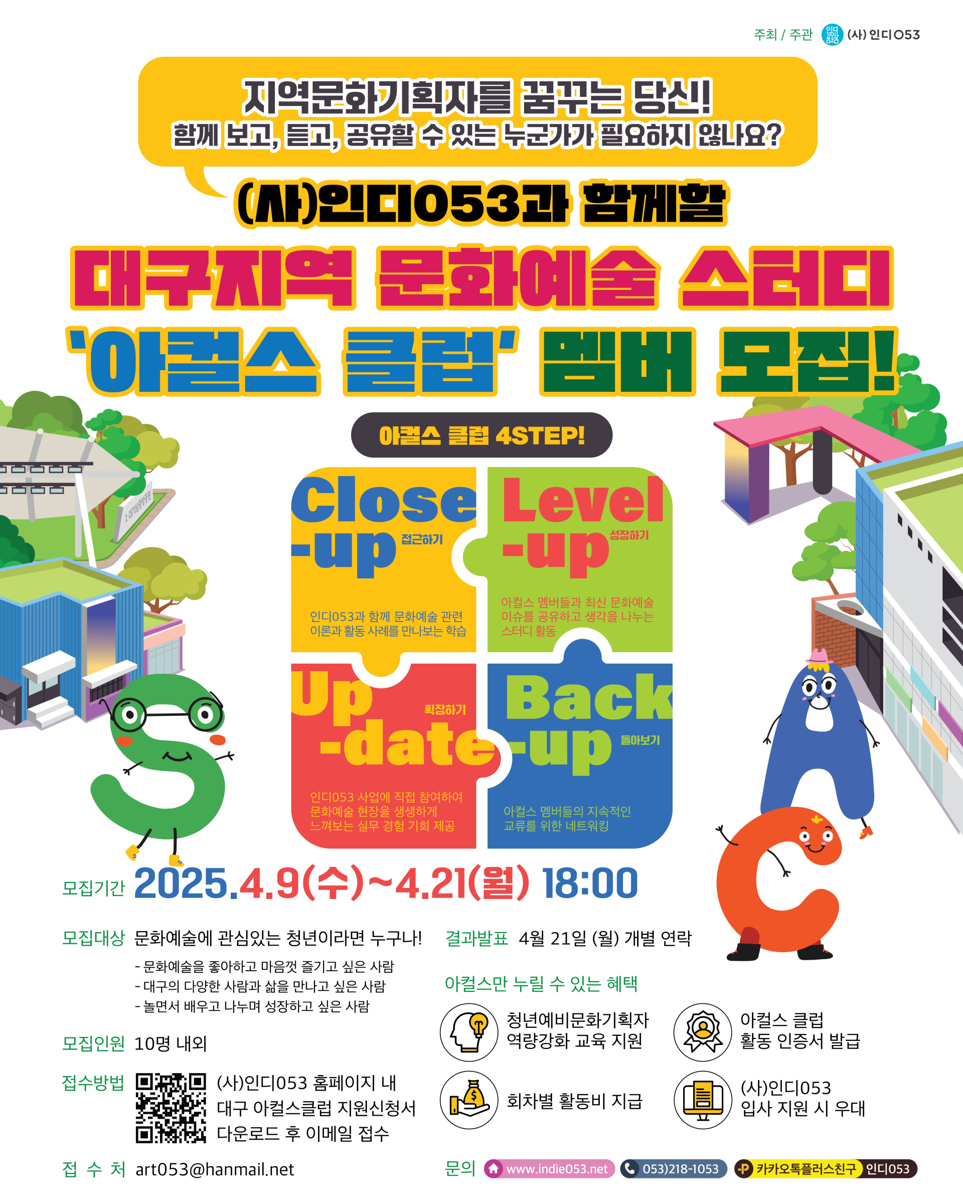 (사)인디053과 함께할 ‘아트컬처스터디 클럽’ 멤버를 모집하오니 문화예술에 관심 있거나
