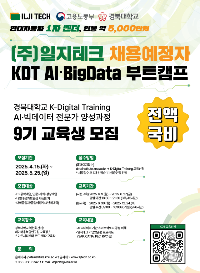 경북대학교 데이터융복합연구원에서 일지테크 채용예정자 부트캠프(K-Digital Training AI·빅데이터 전문가 양성과정 9) 교육생을 모집합니다.