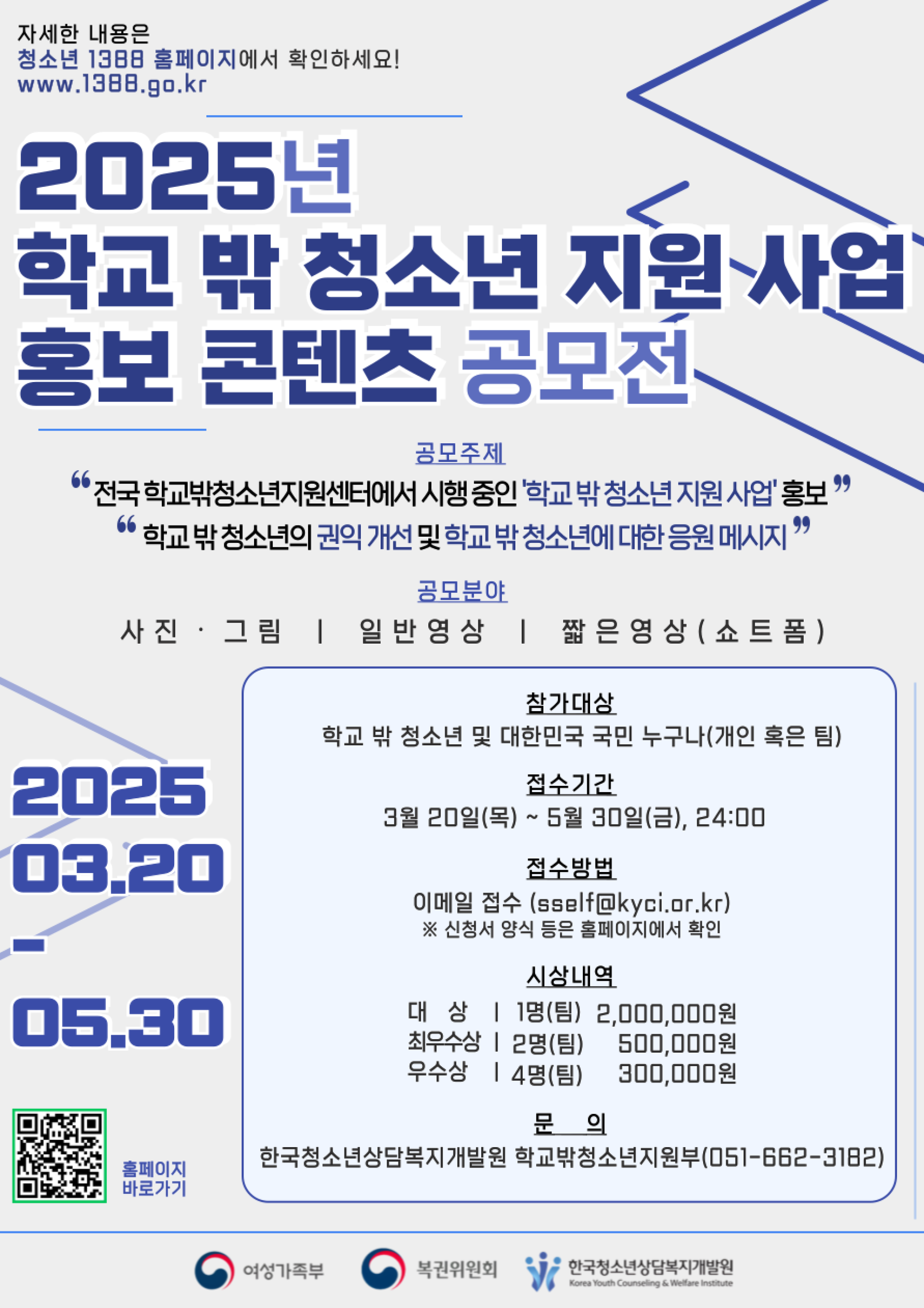 - ☏ 한국청소년상담복지개발원 학교밖청소년지원부 공모전 담당자(☎ 051-662-3182)